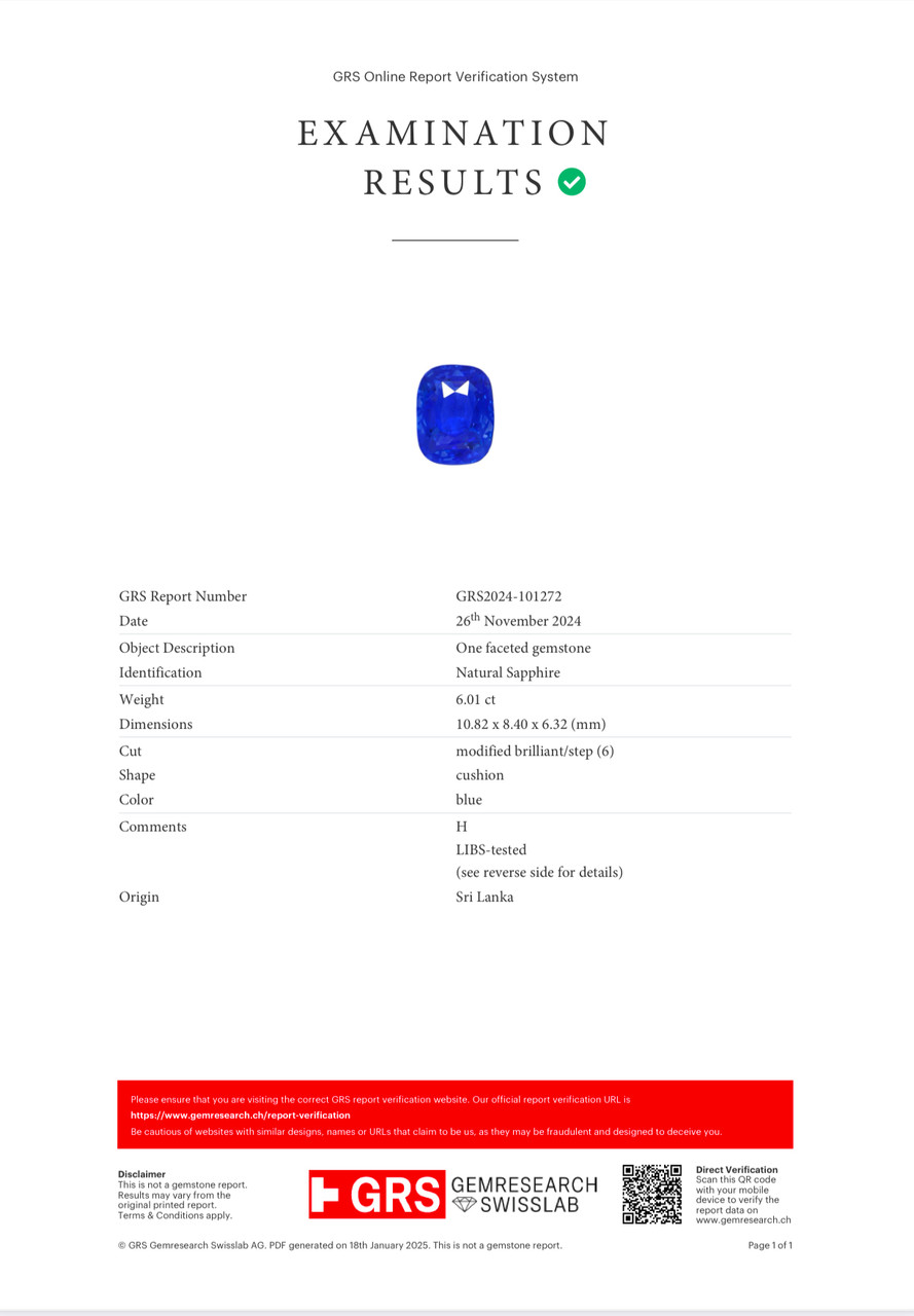 Blue Sapphire Natural GRS Certified Cushion Facet Cut VVS Clarity Royal Blue Loose Precious Gemstone