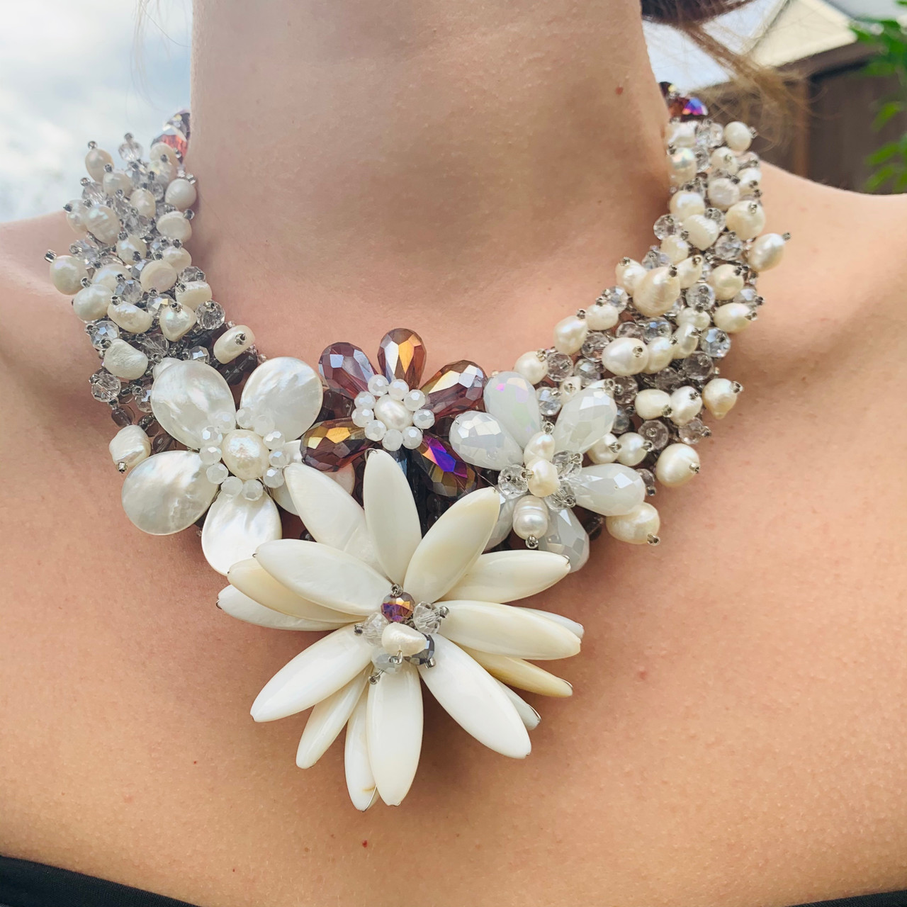 Handmade Boho Necklace 20" with Shells Freshwater Pearls & Sunflower Leaf Pendant Choker