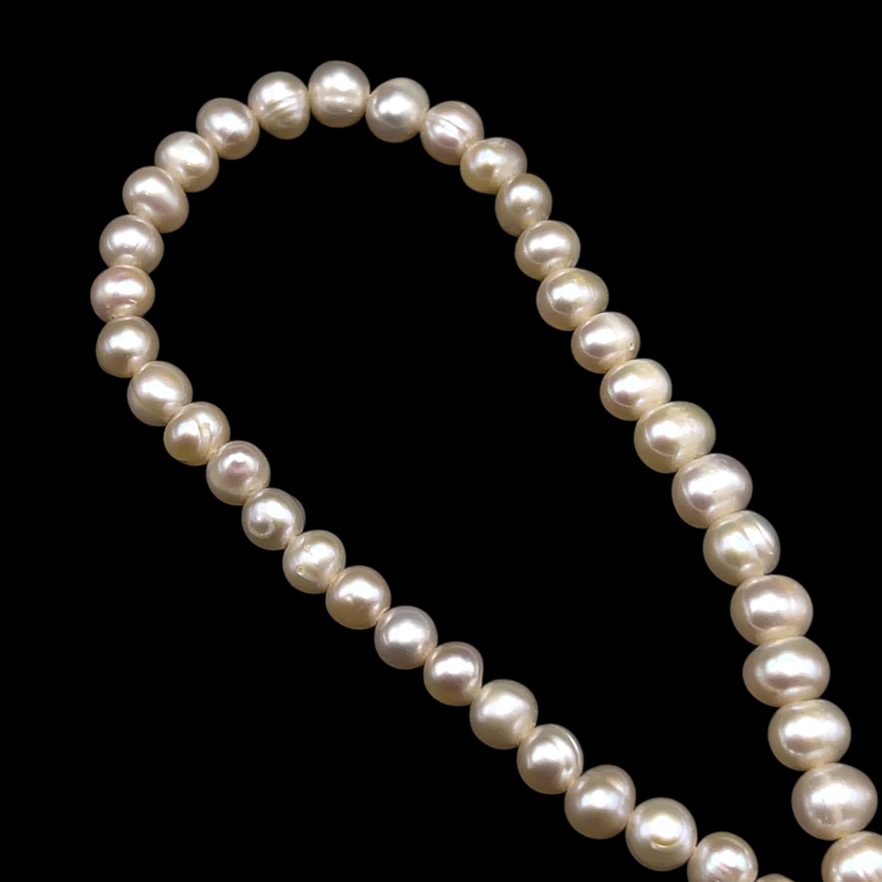 Radiating elegance and rich natural beauty, this freshwater pearl strand is a timeless choice for jewelry making. Its classic appeal complements any outfit, from everyday wear to special occasions. Beyond their beauty, pearls are known to promote stress relief, emotional balance, spiritual growth, and protection. Versatile and meaningful, these pearls are perfect for crafting necklaces, bracelets, earrings, or thoughtful gifts that carry both style and intention.