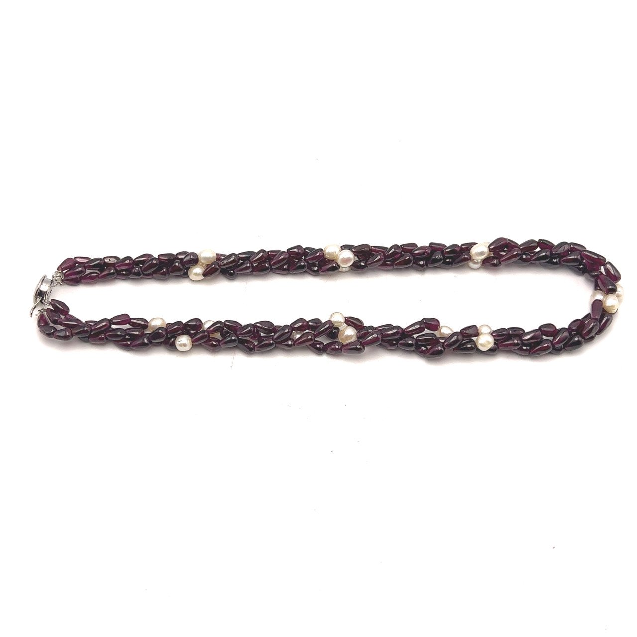 Each gemstone is carefully selected and polished to highlight its natural beauty, while the thoughtful arrangement ensures a comfortable fit and elegant flow along the neckline. Garnet is traditionally associated with passion, strength, and grounding energy, while pearls symbolize purity and sophistication. This necklace is perfect for special occasions, elegant evenings, or as a standout piece in a curated gemstone jewelry collection.
