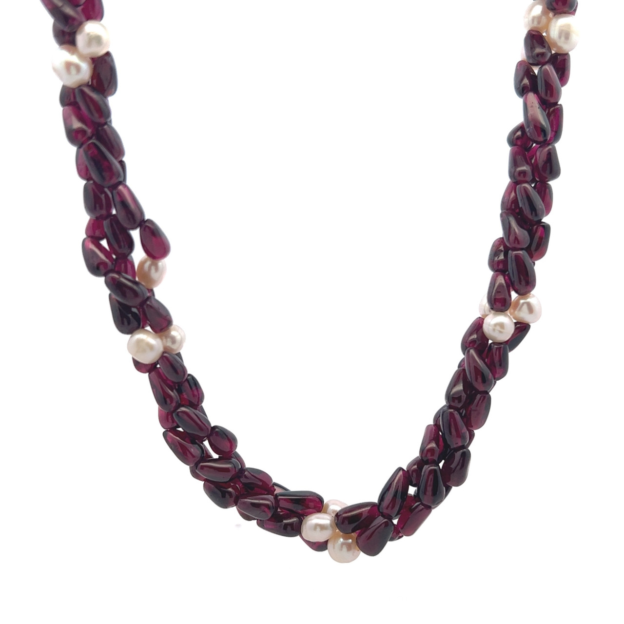 Each gemstone is carefully selected and polished to highlight its natural beauty, while the thoughtful arrangement ensures a comfortable fit and elegant flow along the neckline. Garnet is traditionally associated with passion, strength, and grounding energy, while pearls symbolize purity and sophistication. This necklace is perfect for special occasions, elegant evenings, or as a standout piece in a curated gemstone jewelry collection.