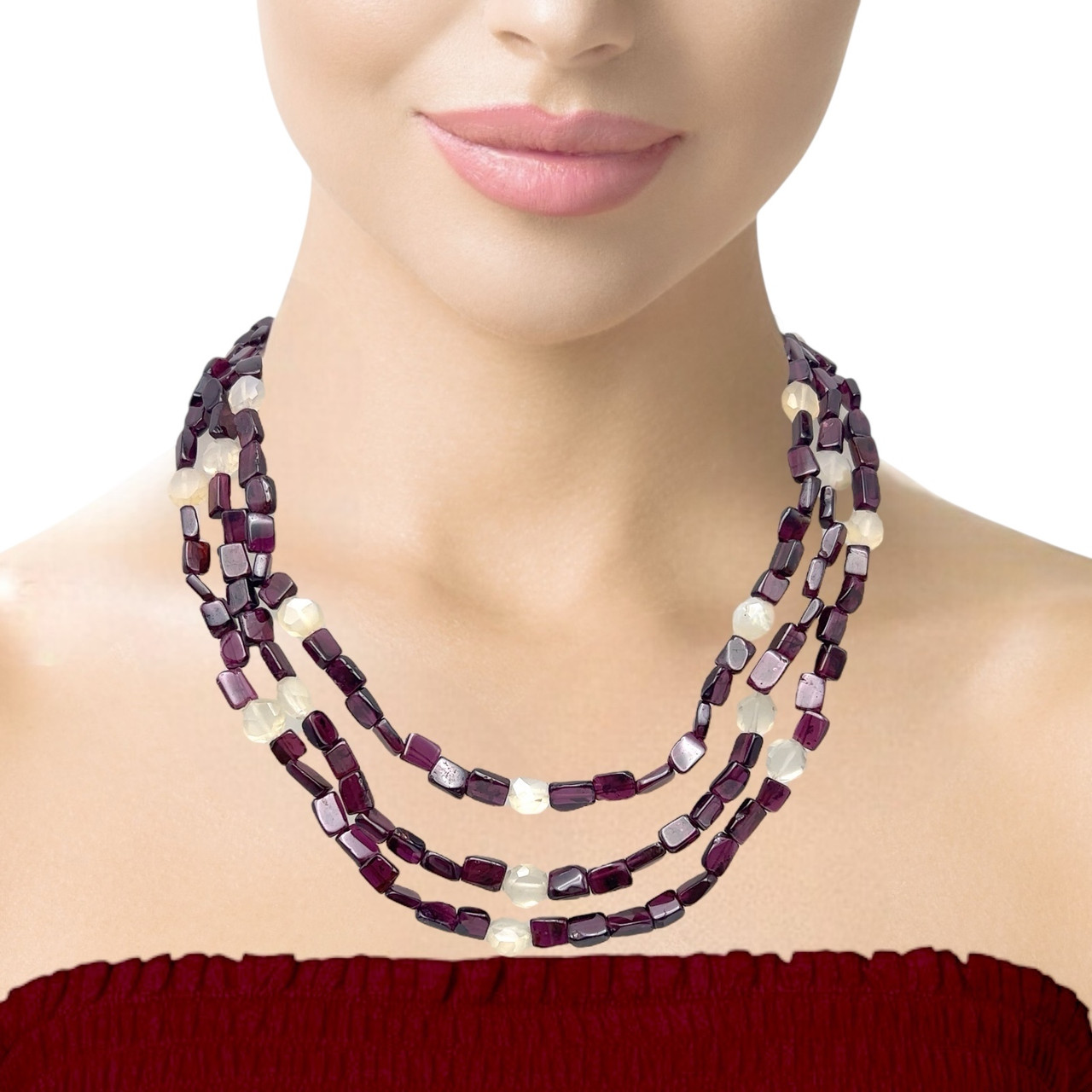 Natural Garnet Smooth Tube & Chalcedony Round Handmade Gemstone Beaded 17.2 Inch Layered Necklace Jewelry