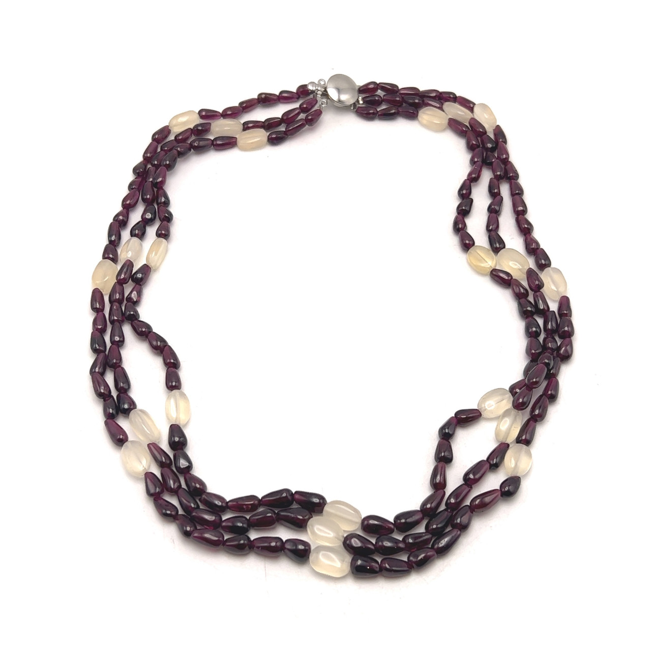 Each gemstone is carefully selected and polished to highlight its natural character, while the layered arrangement provides a graceful drape and comfortable wear. Garnet is traditionally associated with passion, strength, and grounding energy, while chalcedony is admired for its calming and nurturing qualities. This necklace is an elegant choice for special occasions or elevated everyday wear, offering timeless beauty through thoughtful craftsmanship.