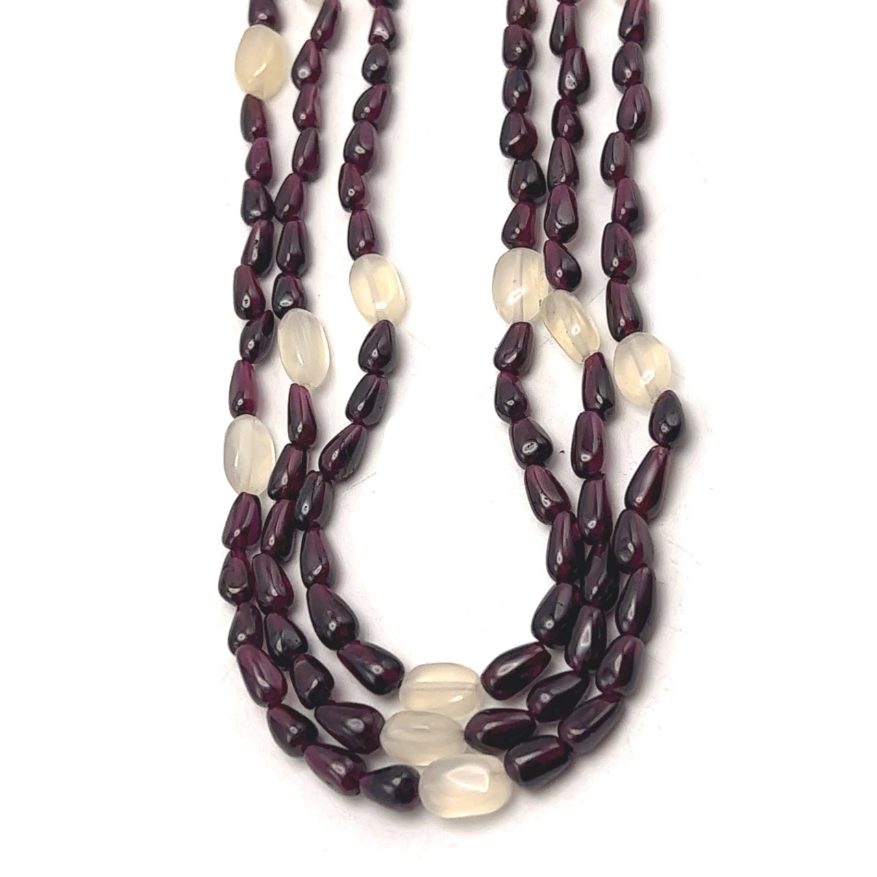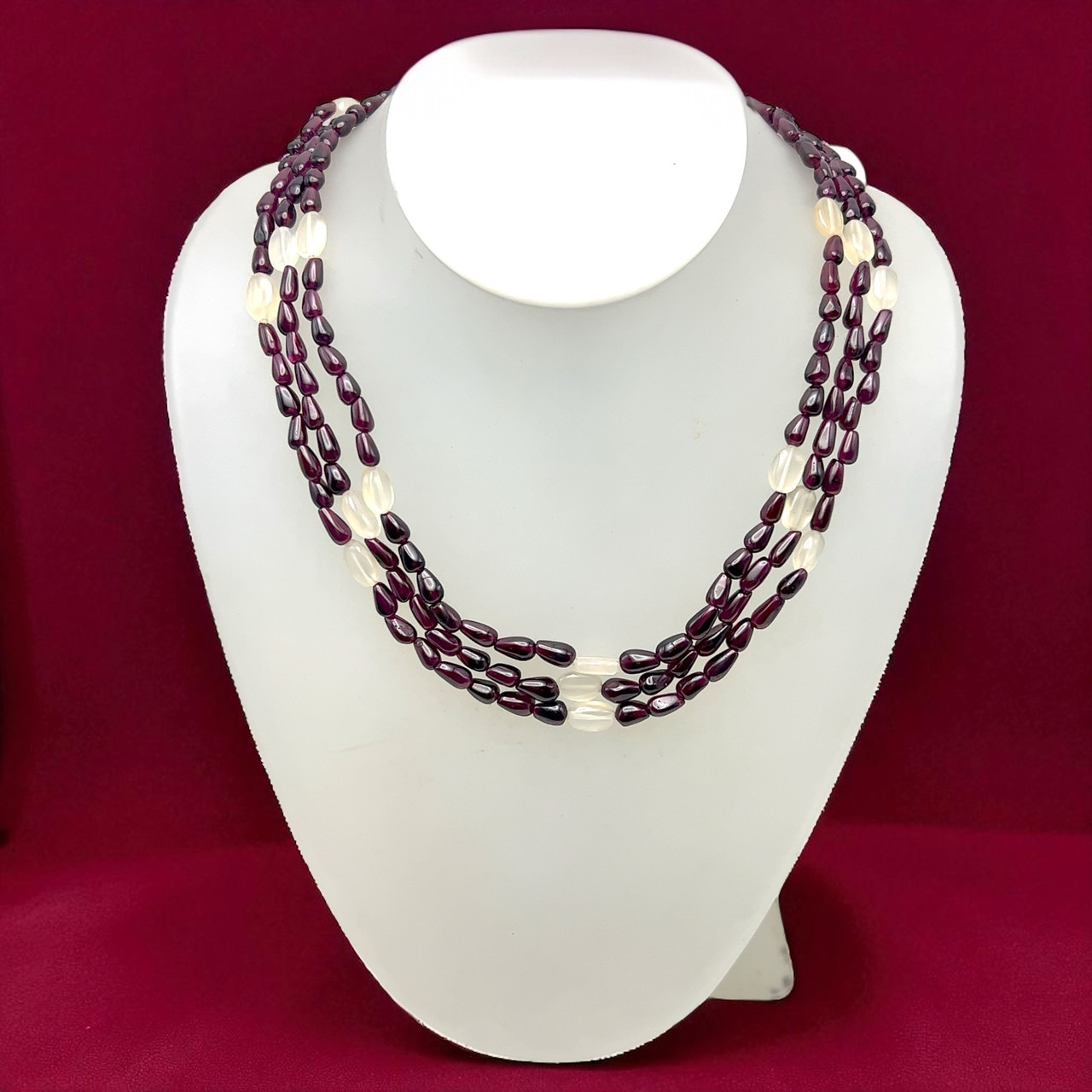 Each gemstone is carefully selected and polished to highlight its natural character, while the layered arrangement provides a graceful drape and comfortable wear. Garnet is traditionally associated with passion, strength, and grounding energy, while chalcedony is admired for its calming and nurturing qualities. This necklace is an elegant choice for special occasions or elevated everyday wear, offering timeless beauty through thoughtful craftsmanship.