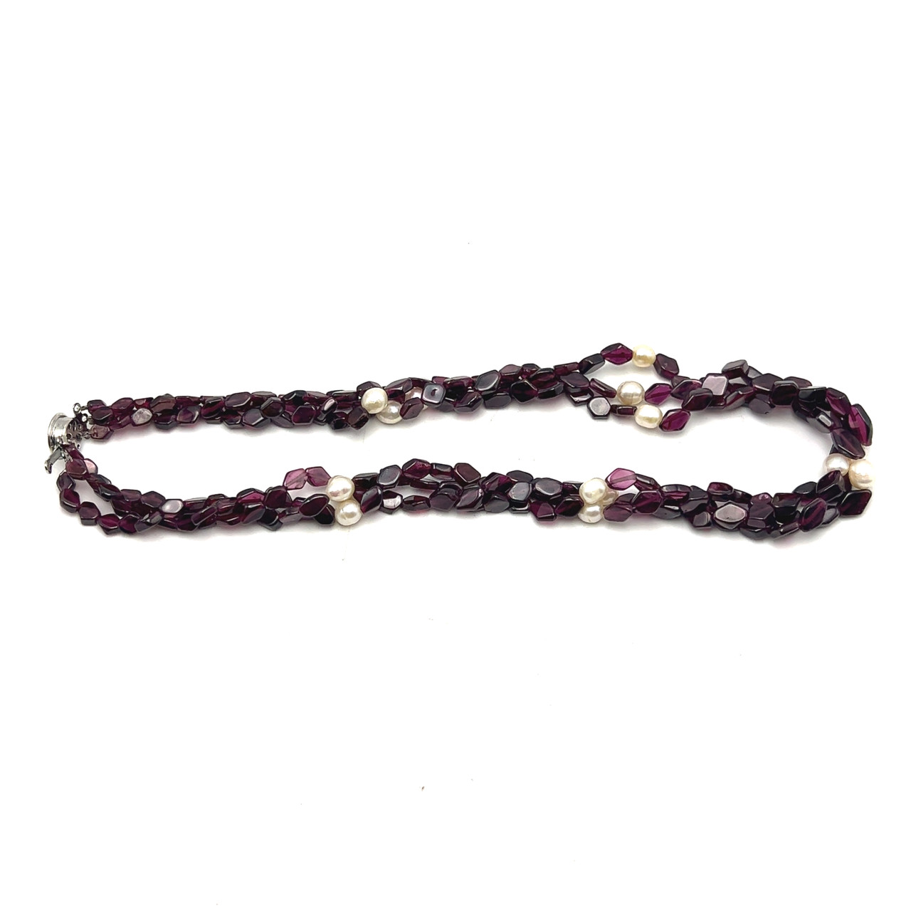 The geometric garnet beads add a modern touch, while the pearls introduce classic elegance, making this necklace suitable for both contemporary and traditional styling. Garnet is traditionally associated with passion, strength, and grounding energy, while pearls symbolize purity and grace, giving this piece meaningful symbolism alongside its visual appeal. Carefully handcrafted for comfort and flow, this necklace is perfect for special occasions, elegant evenings, or as a distinctive statement in a gemstone jewelry collection.