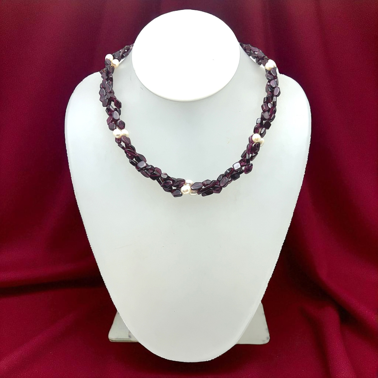 The geometric garnet beads add a modern touch, while the pearls introduce classic elegance, making this necklace suitable for both contemporary and traditional styling. Garnet is traditionally associated with passion, strength, and grounding energy, while pearls symbolize purity and grace, giving this piece meaningful symbolism alongside its visual appeal. Carefully handcrafted for comfort and flow, this necklace is perfect for special occasions, elegant evenings, or as a distinctive statement in a gemstone jewelry collection.