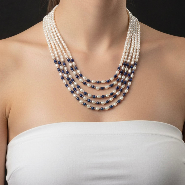 Multi Layered Classic Pearl with Lapis Lazuli Necklace