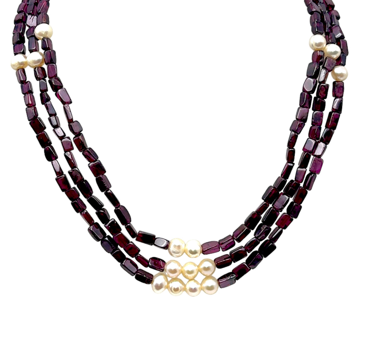 Natural Garnet Chobra 6mm & Pearl Layered Gemstone Necklace