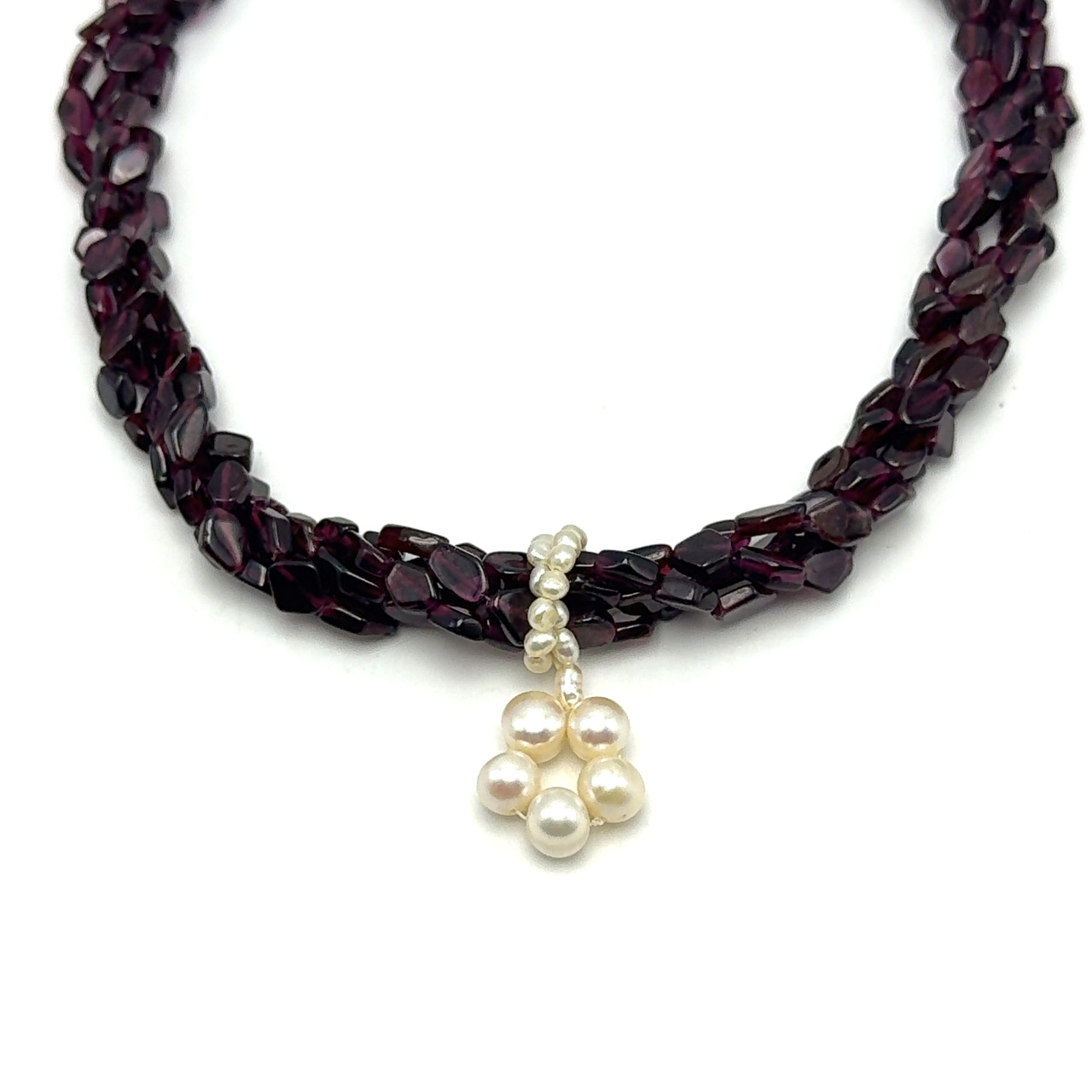 Natural Garnet & Plain Smooth Pearl Twisted Necklace | Umber and White Color | Handmade Gemstone Jewelry