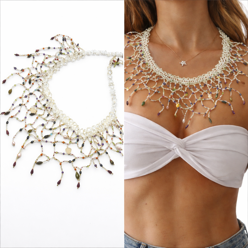 This handcrafted beaded lace collar necklace is created using intricate freeform gemstone beadwork that mimics delicate lace made entirely from natural gemstones. Designed as a dramatic bib collar, the flowing net structure and gemstone fringe create movement, texture, and light reflection from every angle.A true artisan statement piece, this necklace blends textile-inspired bead weaving with gemstone accents to form a wearable work of art. Perfect for resort wear, bridal styling, festivals, photoshoots, and statement occasions.