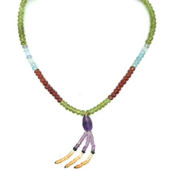 Natural Peridot Garnet Aquamarine Citrine Rondelle Facet Beads with Amethyst Drop Gemstone Necklace
